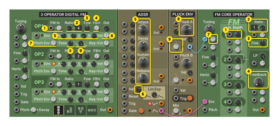 Now you can experiment with using different settings for the operator’s Out, Ratio and ADSR knobs to produce an infinite number of sounds. Connecting the Vel input and adjusting the operator’s Vel knobs will add even more control over the sound.