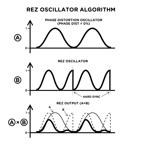 The signal of the rez oscillator is multiplied by the phase distortion oscillator (amplitude modulation) to remove the falling edge caused by hard sync.